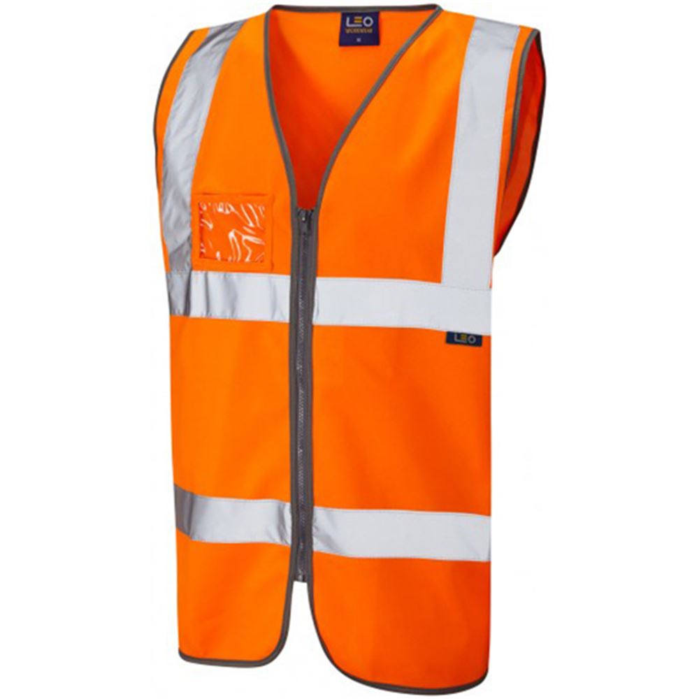 Leo Workwear Rumsam Orange EcoViz Zip Front ID Pocket Hi Vis Vest